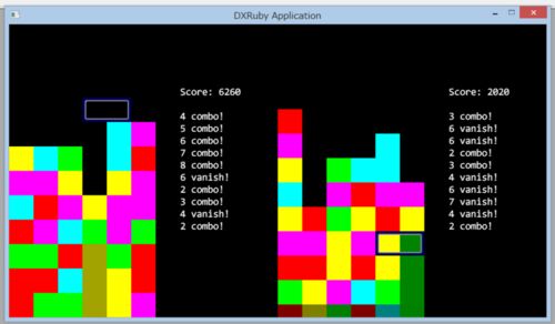 まだ全然できてないけど。 とりあえずフィールドを2つ並べて、左は自分が動かして、右はAIで動かして、どちらかがゲームオーバーになったら終了、っていうのはできました。 あとはオジャマを作れば一応対戦はできる…かな?オジャマを作るのもけっこう面倒そ…